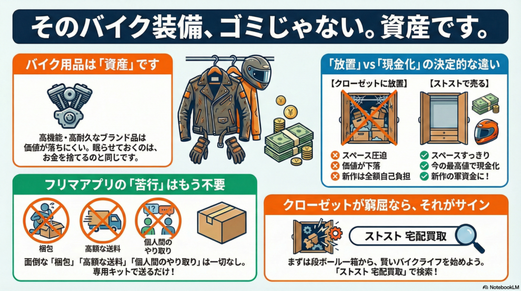 バイクアパレルは「ゴミ」ではありません。賢く現金化して、新作への軍資金に変える。そんなスマートなバイクライフの始め方を提案します。
