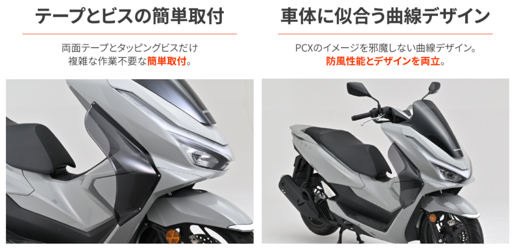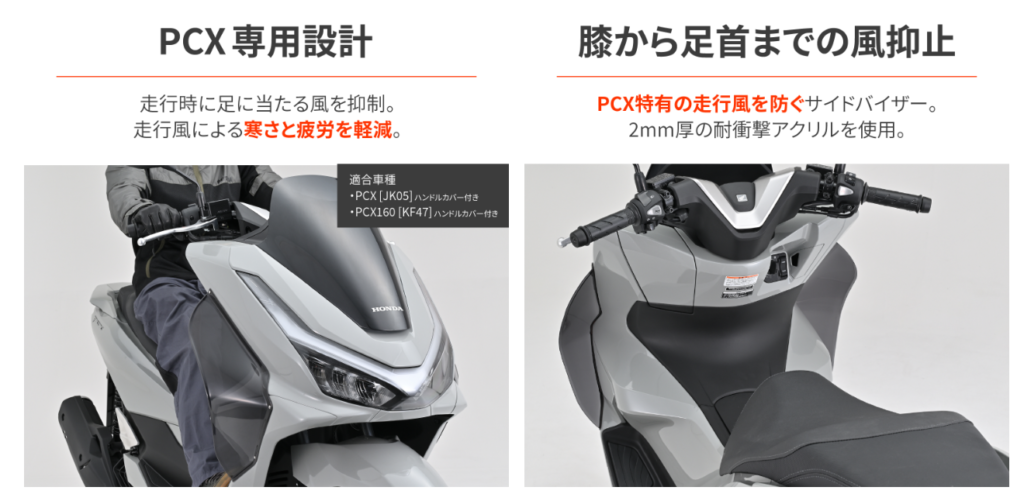 PCXは完成されたスクーターですが、走行風の物理法則からは逃れられません。特に足元に巻き込む風は、冬場にはあなたの膝を容赦なく破壊しにきます。このサイドバイザーは、そんな過酷な現実を「見なかったこと」にするための、大人のための防具です。