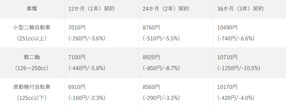 任意保険は家族の車のファミリーバイク特約で月〇百円レベル。