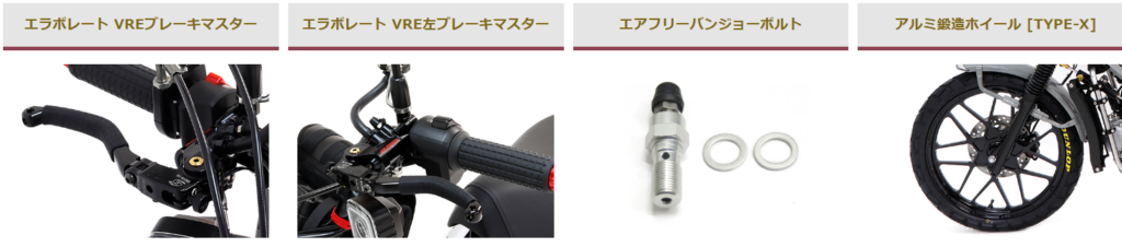 | マスター (L) | エラボレート VRE左ブレーキマスター | 独自開発の可変レシオレバーを搭載。レバーの支点~作用点を 0.25mm刻みで調整可能。ブレーキタッチを最適な状態に近づける。 | Φ14(18-16mm (0.25mm刻み)) |