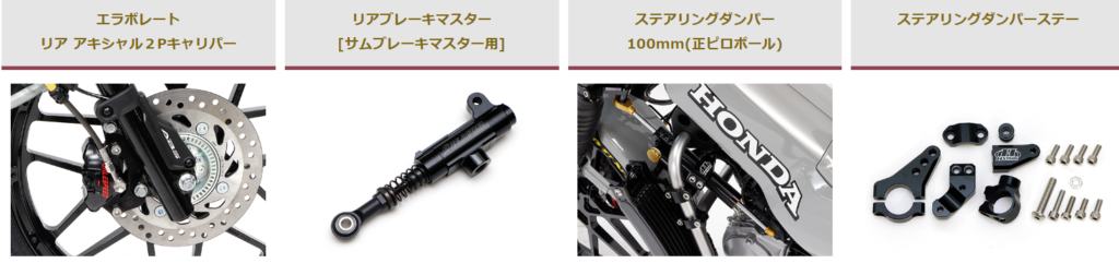 | 車体安定 | ステアリングダンパー 100mm (正ピロボール) | ハンドルに伝わる振れを制御し、挙動を安定させる。操縦安定性が向上し、ライダーに安心を提供する。 | CSC タイプ |