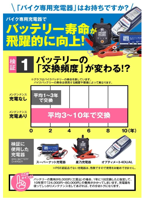 バイクから外さずに繋ぎっぱなしにできるタイプが多く、高価なものではありません。バッテリー上がりのロードサービスを呼ぶ費用を考えれば、すぐに元が取れる投資です。