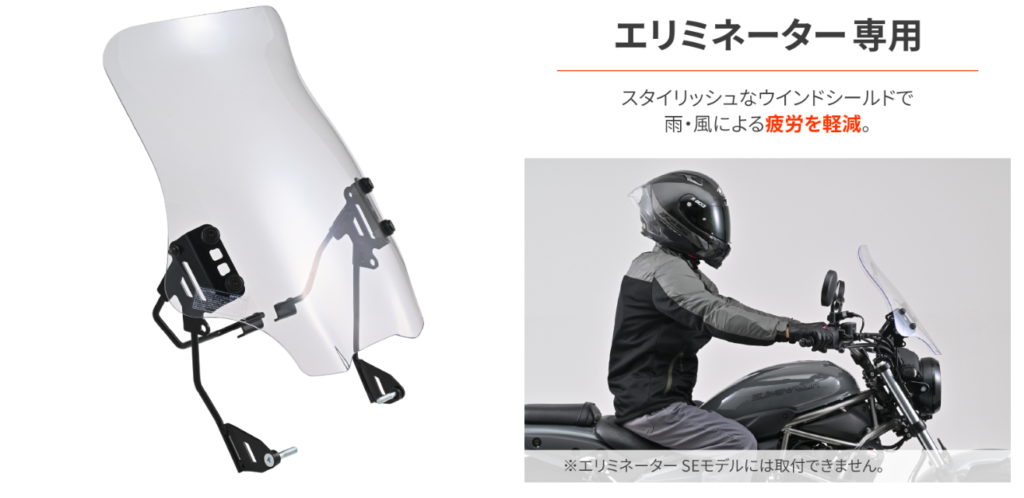 エリミネーターのようなアップライトなポジションは、街乗りでは楽ちんですが、高速道路では全身で風を受け止める「人間帆掛け船」状態になります。このシールドは、そんなあなたの軟弱な……失礼、繊細な上半身を守るための盾です。