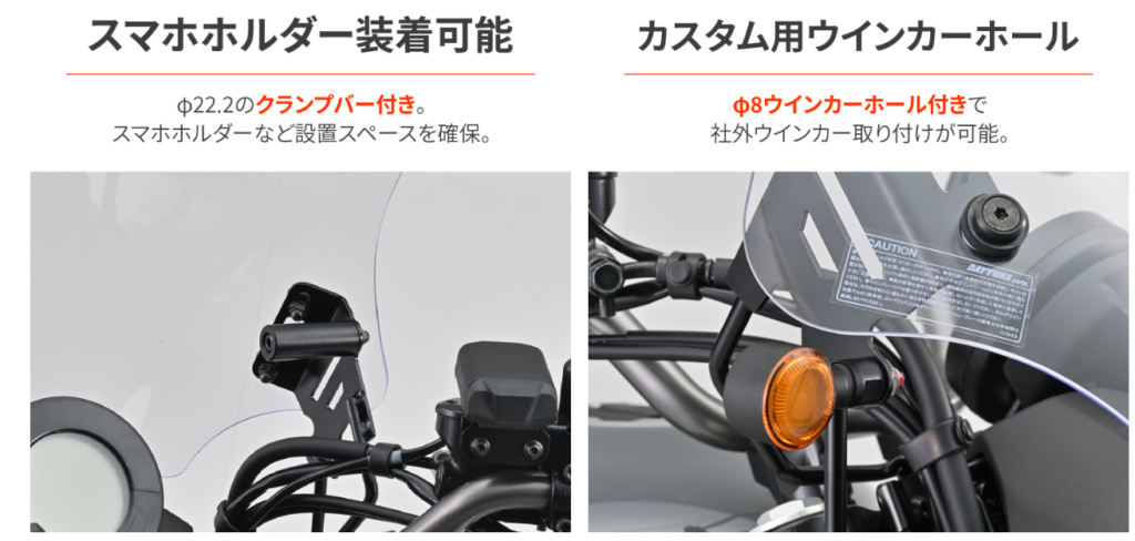 メーター上に全長60mmのクランプバーを標準装備。ハンドル周りに後付けのステーをゴチャゴチャ生やす必要はありません。視線の先にスマホを置けるので、ナビを見ながらのライディングもスマート(かつ安全)になります。