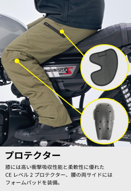 - 「バイク降車後はカジュアルに歩きたい」という人は、このタイプとオーバーパンツを組み合わせれば、脱いだ後の街歩きも違和感ゼロです。